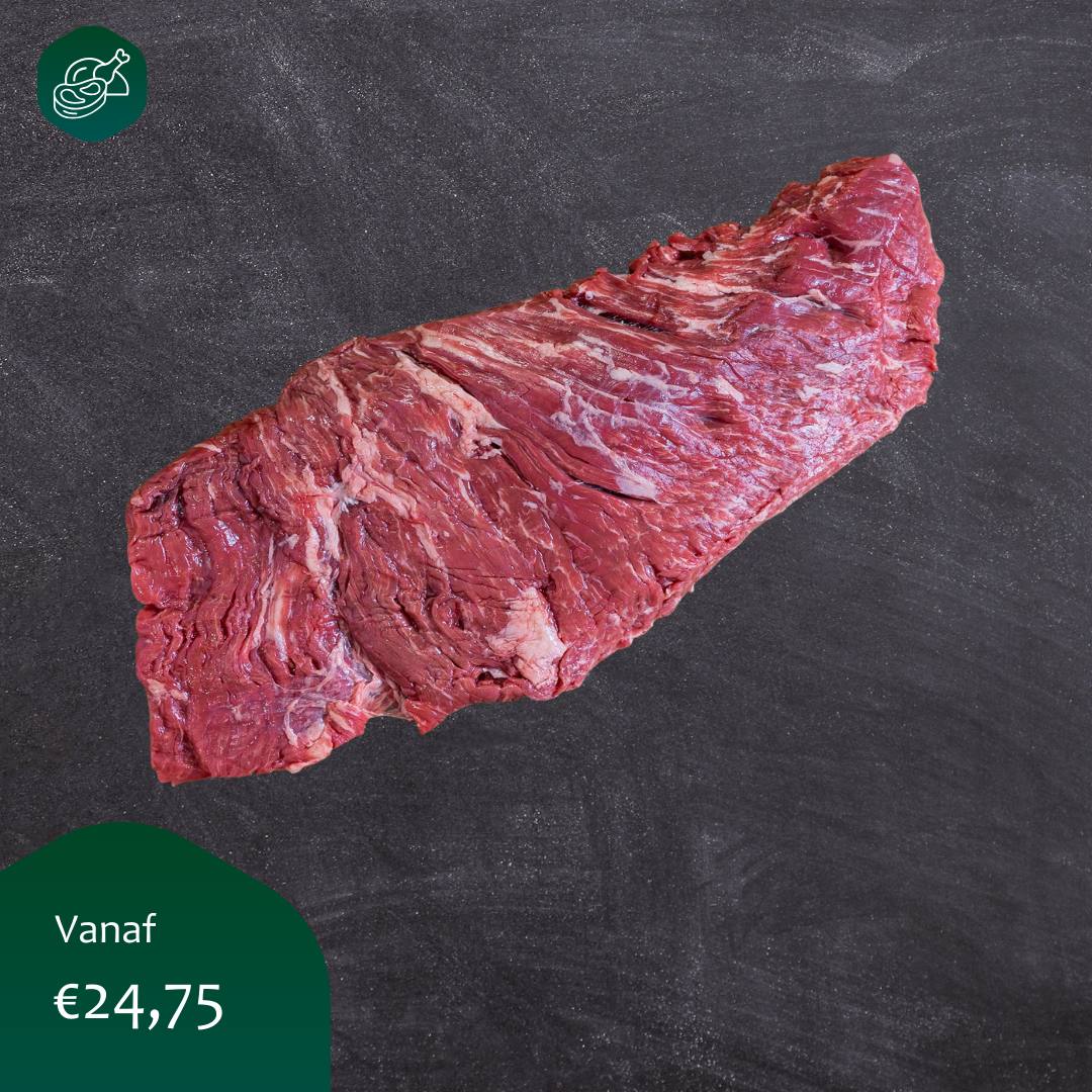 De bavette is een karaktervol stuk rundvlees, gesneden uit de flank van het rund. Dit vlees staat bekend om zijn grove structuur en diepe rundvleessmaak. Bavette is iets steviger van structuur, maar bij de juiste bereiding en snijwijze bijzonder sappig en vol van smaak. Een favoriet bij liefhebbers van puur en eerlijk vlees. Uitermate geschikt voor bereiding in de pan, op de grill of barbecue en perfect voor wie houdt van een uitgesproken vleessmaak. De bavette wordt vers vacuüm verpakt en daarna direct diepgevroren om de kwaliteit, smaak en versheid optimaal te behouden. Gewicht kan iets naar boven of beneden afwijken.