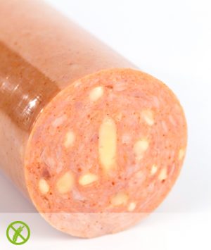 kipseparatorvlees(39%), kippenvlees(15%), kalkoenvlees, kippenvet, water, kaas(8,6%) (MELK, aardappelzetmeel, zout, zuursel, conserveermiddelen(E250), stremsel, kleurstoffen(E160b, E160a)), kippencollageen, aardappelzetmeel, zout, voedingszuren(E325), emulgatoren(E451), aroma ( bevat SOJA ), tomaat, ui, kruiden en specerijen, MOSTERDzaad, chili peper, zwarte peper, uienpoeder, kaas(0,058%), maltodextrine, MOSTERD, gistextract, SELDERIJ, smeltzouten(E339), wei eiwit, palmvet, citroenzuur (citraat)(E330), palmolie, LACTOSE, antioxidanten(E316, E300), MELKeiwit, dextrose, aroma, conserveermiddelen(E250), paprika extract, bieten extract, Glutenvrij
