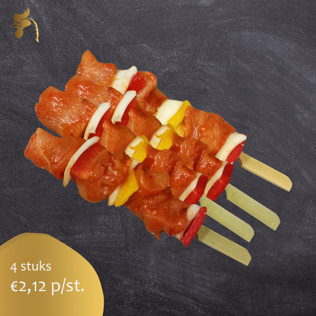 Heerlijke kipfiletspies gecombineerd met ui en paprika. De kip shaslick stokjes worden geleverd per 4 stuks (diepgevroren) en wegen ca. 95 gr. p/st.