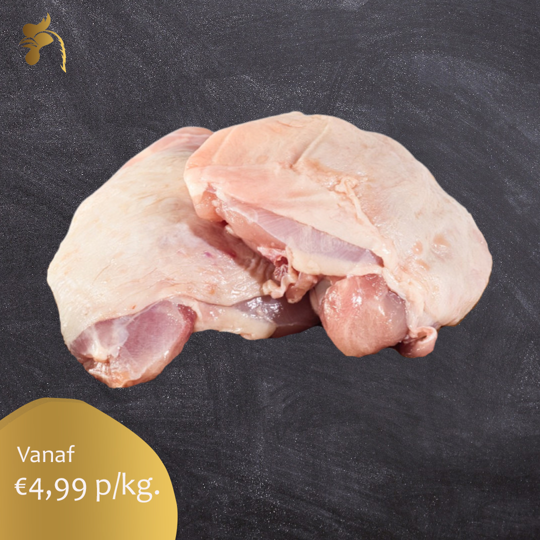De kipkarbonade is een heerlijk stukje mals vlees met bot. De karbonade komt van het bovenste stuk van de poot met vel een been (bot). Onze kipkarbonades zijn onbewerkt, super vers (dus niet ingevroren!) en verkrijgbaar per 1, 2.5, 5 of 10 kg. Vers is bij ons ook écht vers, het vlees dat je bij ons besteld wordt 1 of 2 dagen van tevoren geslacht.