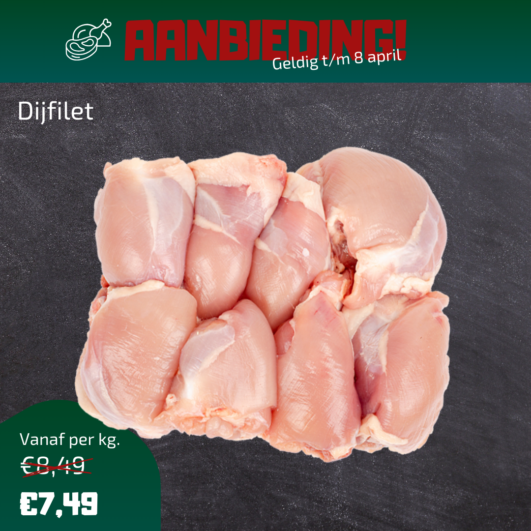 Snijd het in blokjes of reepjes en marineer ze met jouw favoriete kruiden. Bestel je dijenfilet eenvoudig online. Verkrijgbaar in 1, 2.5, 5 of 10 kg.