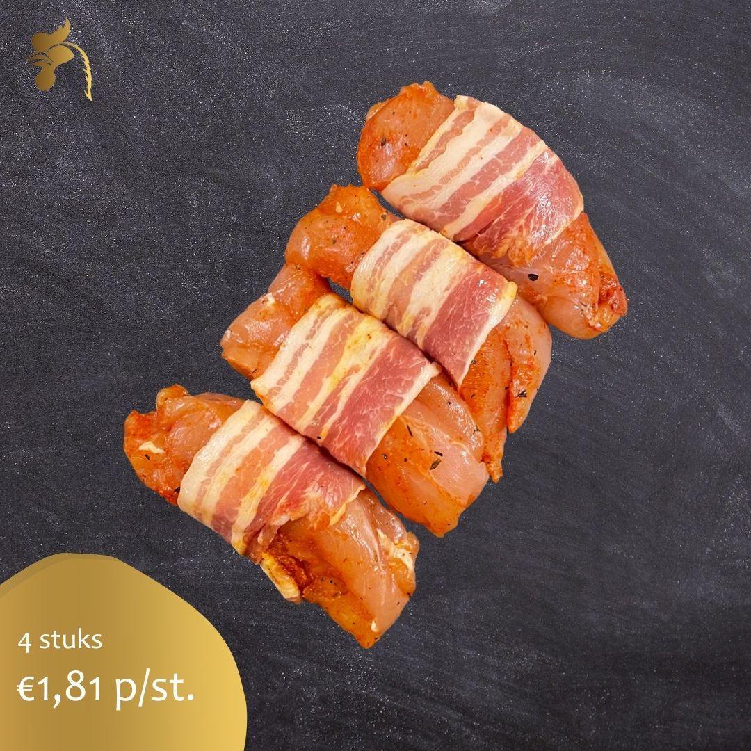 Ambachtelijk bereide kipfilet vinken. Heerlijk op smaak gekruid en omwikkeld met spek. Smaakvol en lekker mals. De kipvinken hebben een gewicht van ca. 125 gr. p/stuk.