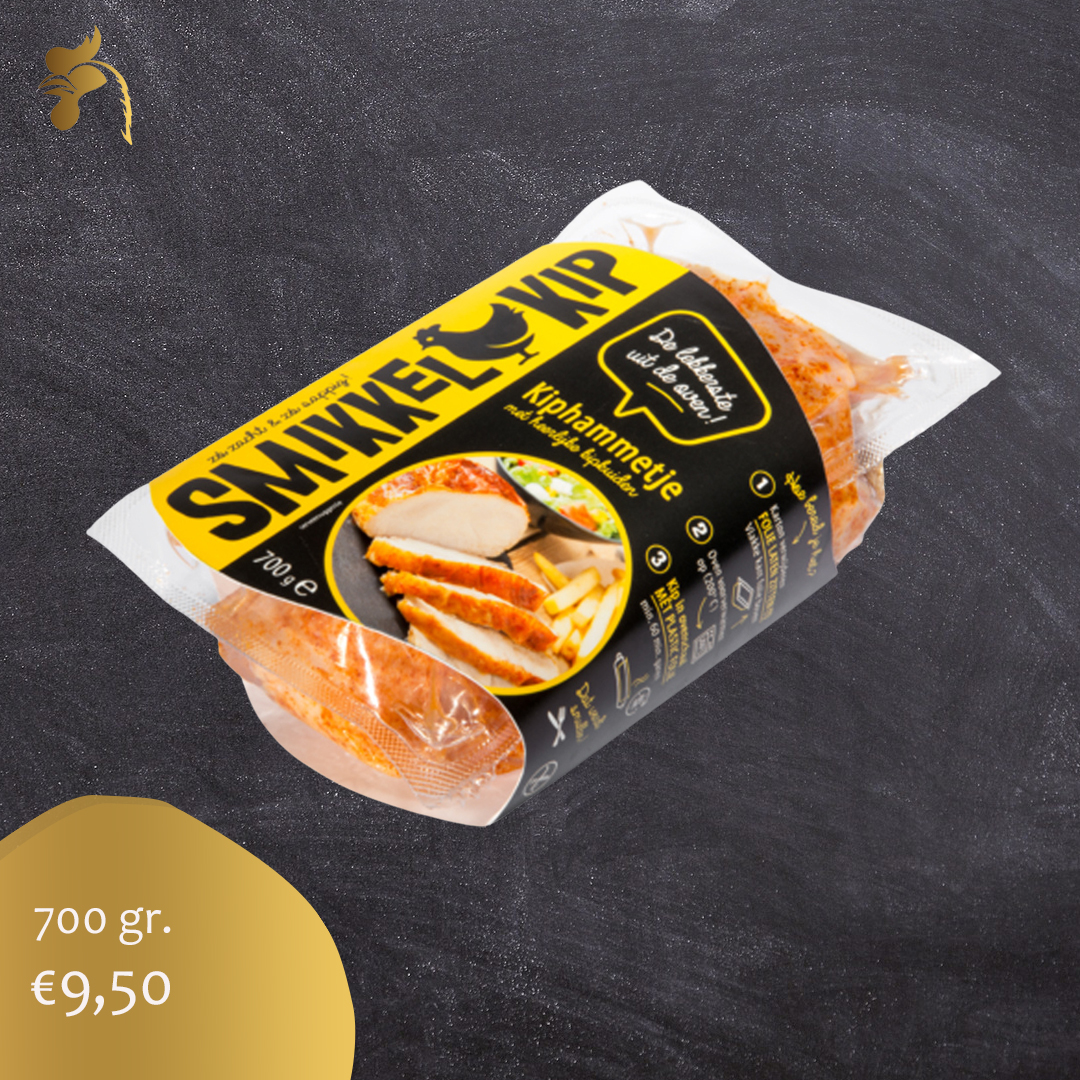 Als je na 10 minuten in de oven kijkt, zie je het folie openspringen. 60 minuten later haal je een delicatesse uit de oven. Zo sappig, zo zacht. Dat is Smikkelkip, de lekkerste uit de oven. Leveringsconditie: diepgevroren.